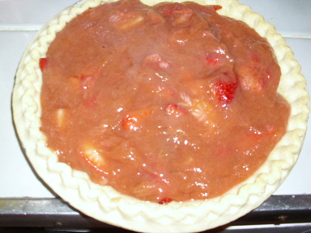 Yesterday evening I decided to cook the rhubarb we have in my flower garden,yes in my flower garden and it has done great again.After I cooked it,cooled it ended up in a lb container for overnight.I finished it off today,reheating the rhubarb and adding a cup of strawberries,few drops of lemon juice and then a tbs. or so of Strawberry gelatin and of course Sugar,enough for taste,and between the lemon juice and sugar both take the Tang of the Rhubarb.Place another cup full or so of Strawberries in the bottom of the Pie Shell.All together for 2 Pies I used 2 lb of Strawberries.I looked at a couple of Recipes again and came up with my own I guess you could say.We grew up with Strawberry and Rhubarb pies,and tried to remember how my mom fixed them.So now all we have to do it add the Cool Whip.Hope everyone has tried or will at least try Strawberry and Rhubarb Pies once.